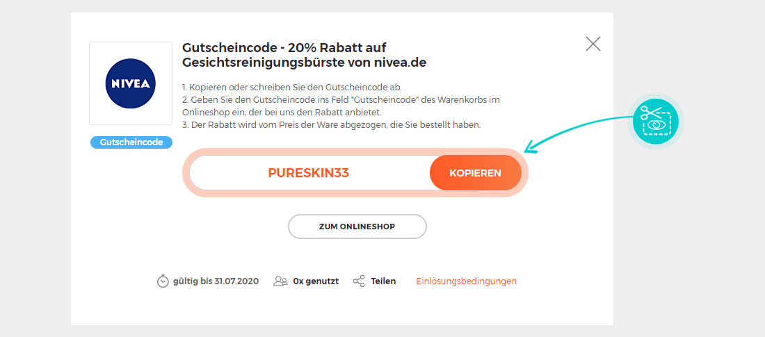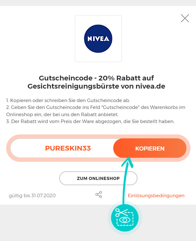 Kopieren Sie den Gutscheincode oder schreiben Sie ihn ab und klicken Sie das Feld „Zum Onlineshop“. Danach werden Sie direkt zu Nivea.de weitergeleitet.
