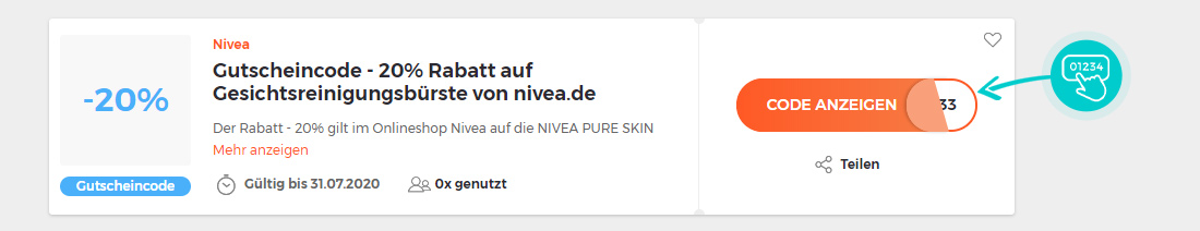 Wählen Sie auf unserer Webseite einen konkreten Gutscheincode, den Sie bei Nivea.de einlösen möchten und klicken Sie das orange Feld „Code anzeigen“ an.