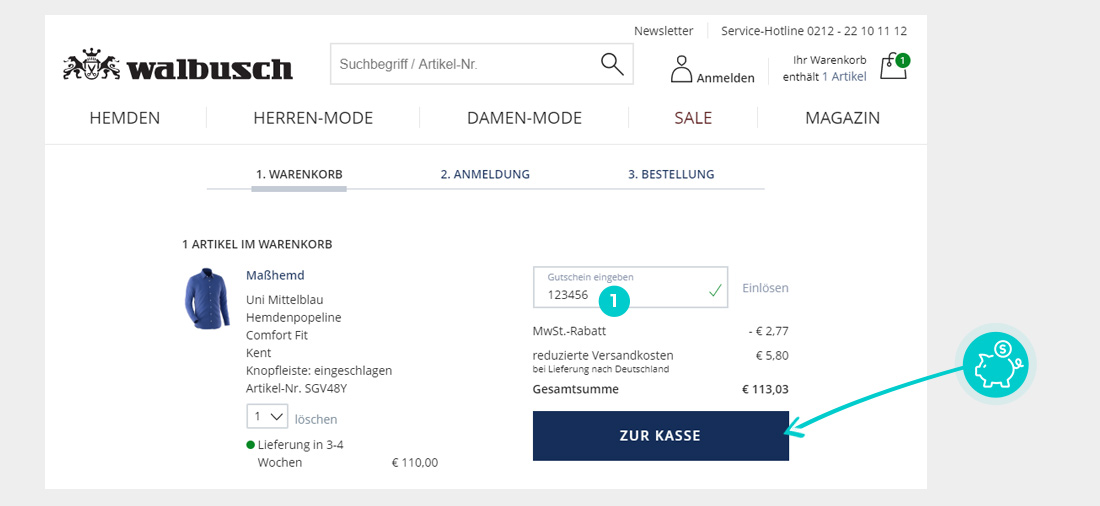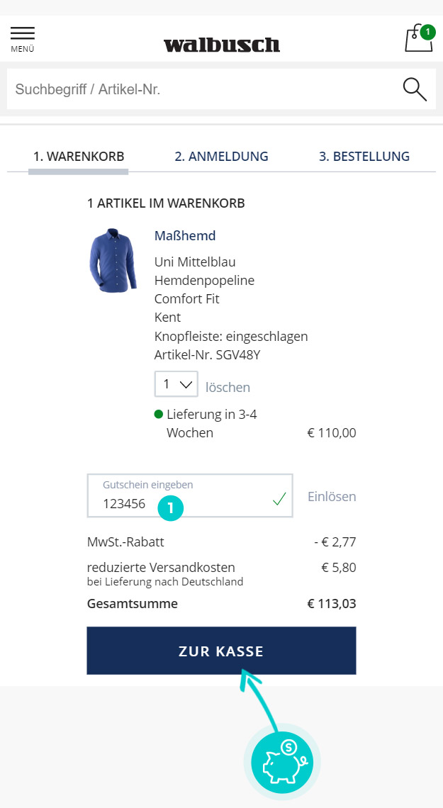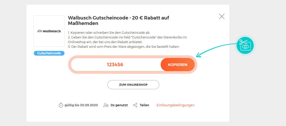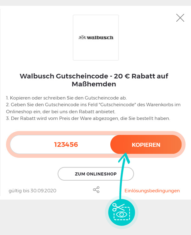 Kopieren Sie den Gutscheincode oder schreiben Sie ihn ab und klicken Sie das Feld „Zum Onlineshop“. Danach werden Sie direkt zu Walbusch.de weitergeleitet.