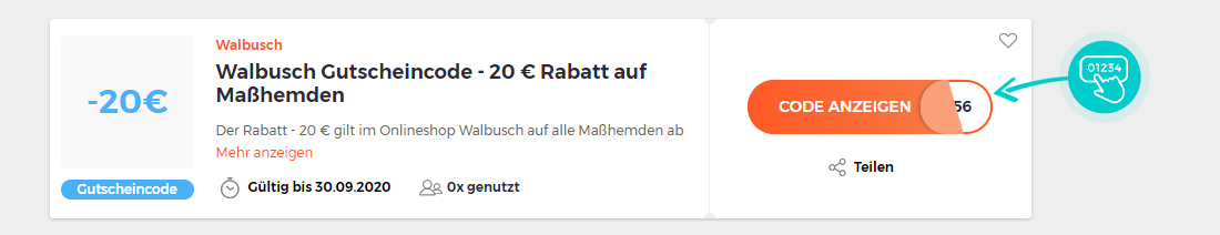 Wählen Sie auf unserer Webseite einen konkreten Gutscheincode, den Sie bei Walbusch.de einlösen möchten und klicken Sie das orange Feld „Code anzeigen“ an.